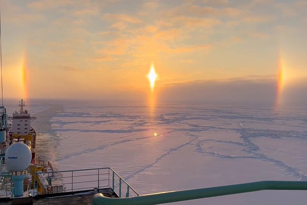 С борта атомного ледокола «Урал» сняли на видео редкое оптическое явление — солнечное гало. Кадры публикует «Атомфлот» в Telegram-канале.