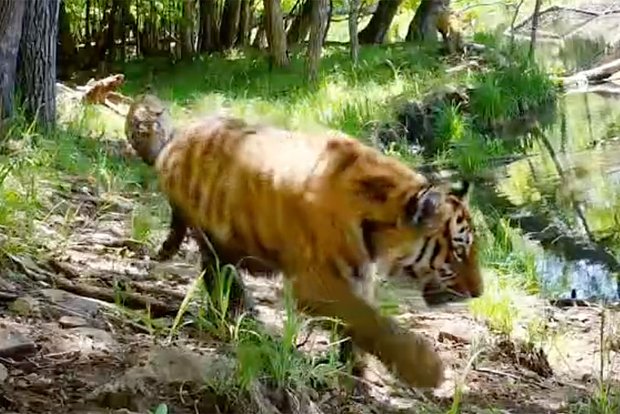 На записи видно, как сначала идет мать — это самка T61F. За ней же по тропе около воды проследовали детеныши 6-7 месяцев. Показано, как каждый из них испачкался по брюхо в грязи и затем неспешно пошел дальше, обнюхивая лесную камеру, которая и запечатлела момент.